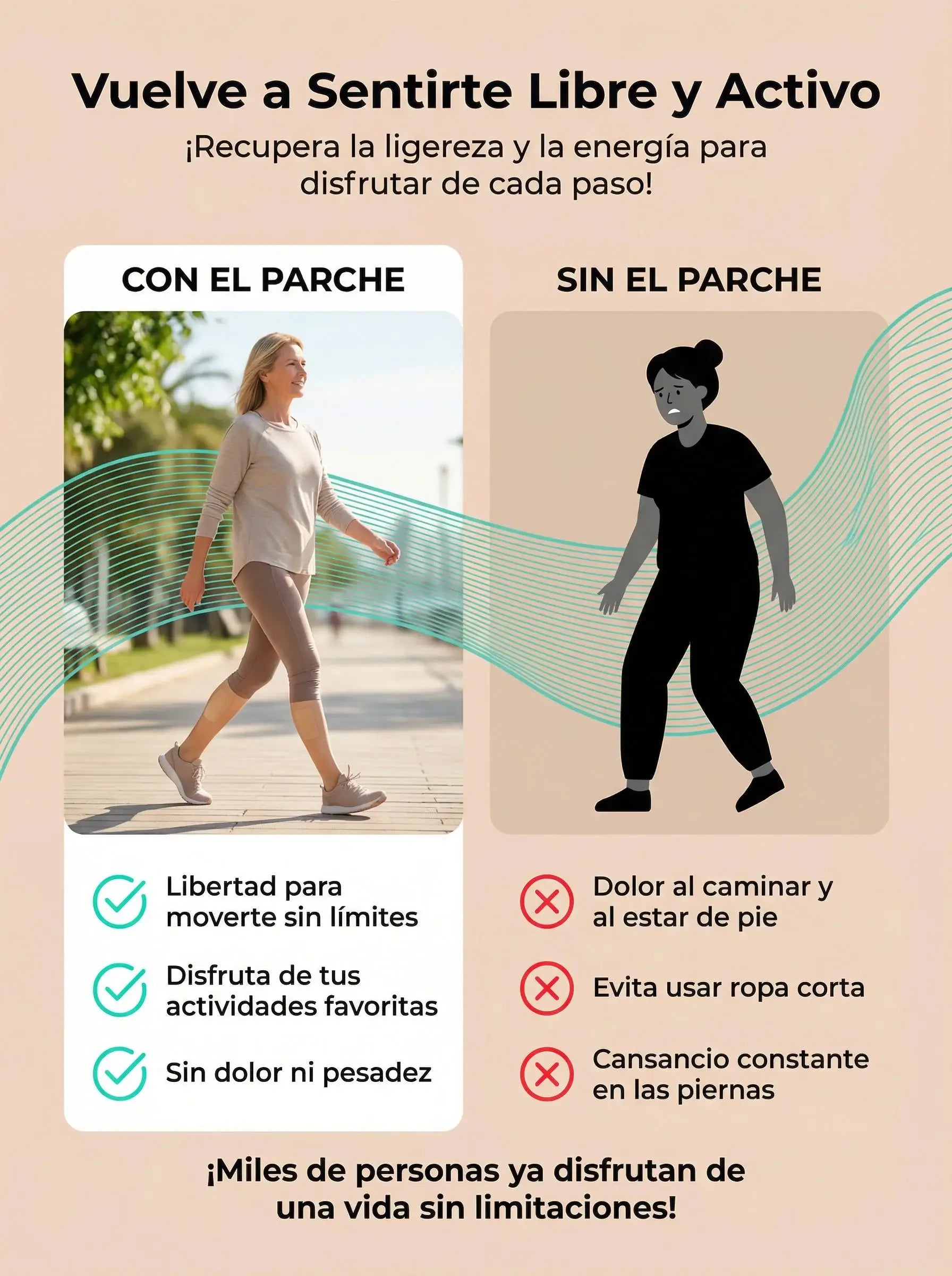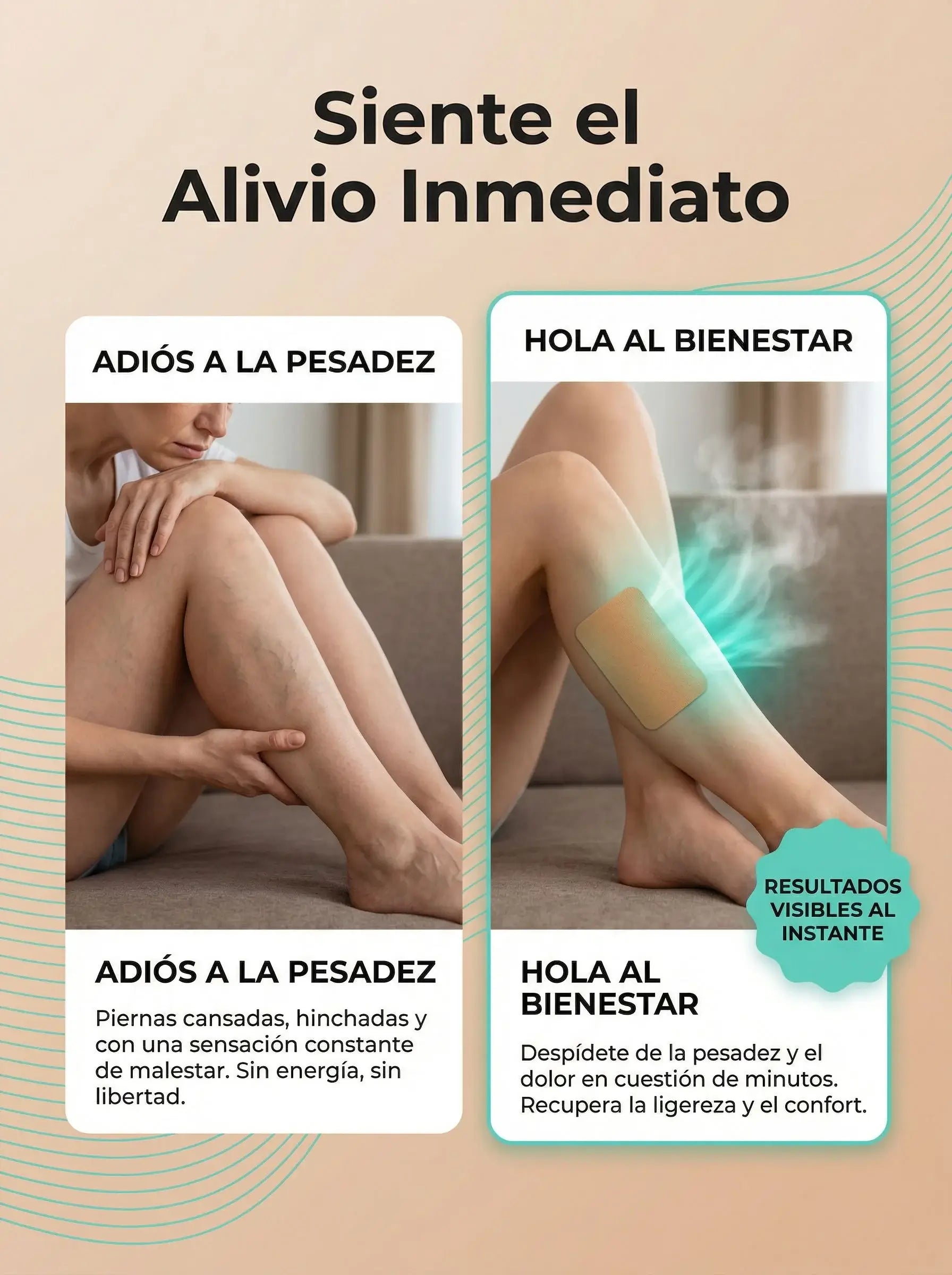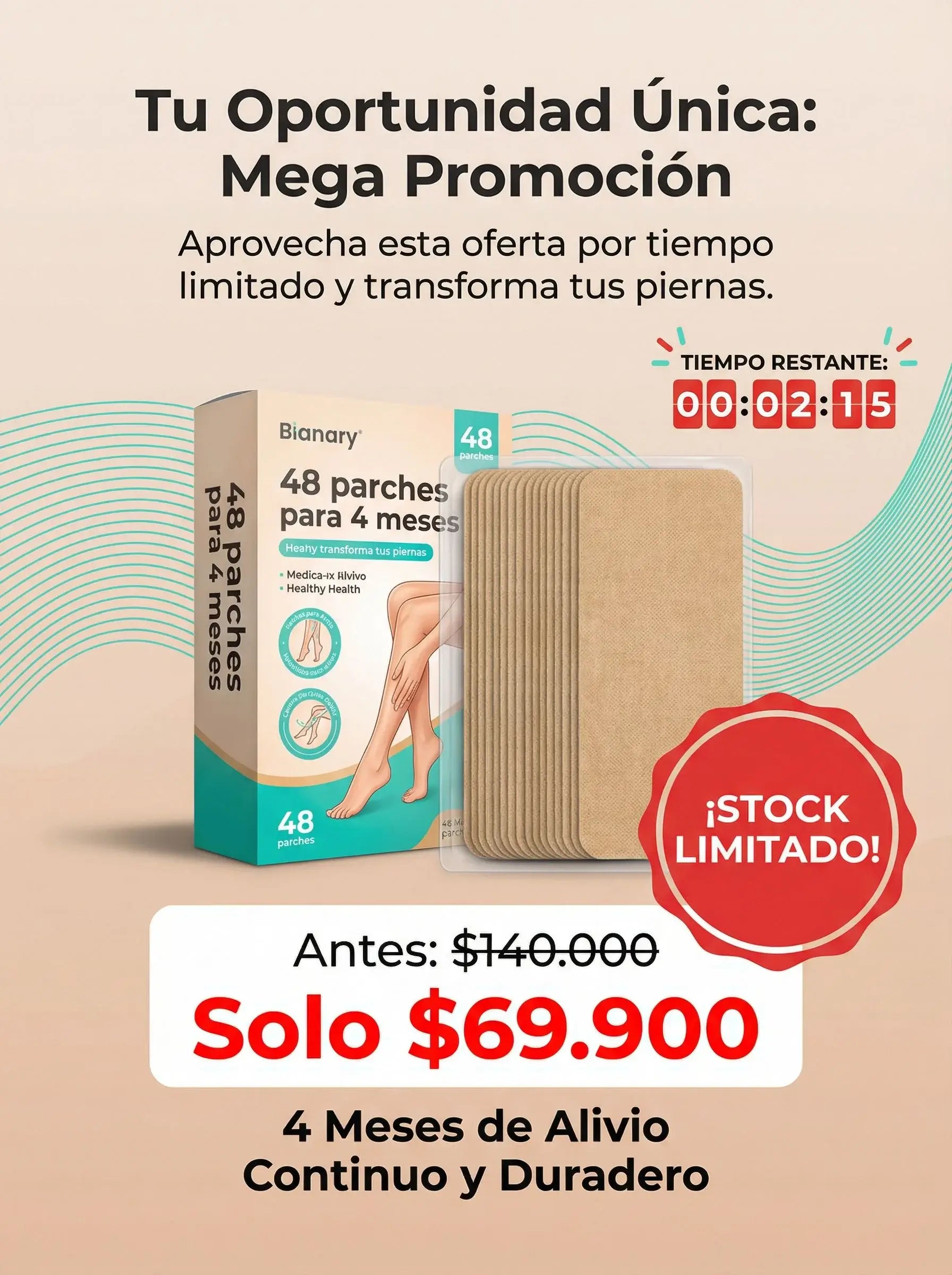 Sobre la piel limpia y seca, aplica el parche directamente en la zona afectada (puedes recortarlo al tamaño deseado). Déjalo actuar de 1 a 2 dias para una absorción profunda de sus componentes naturales. Úsalo diariamente para reducir la inflamación y mejorar la circulación; se recomienda un tratamiento constante de2 a 4 semanaspara ver resultados óptimos en la salud y apariencia de tus piernas.